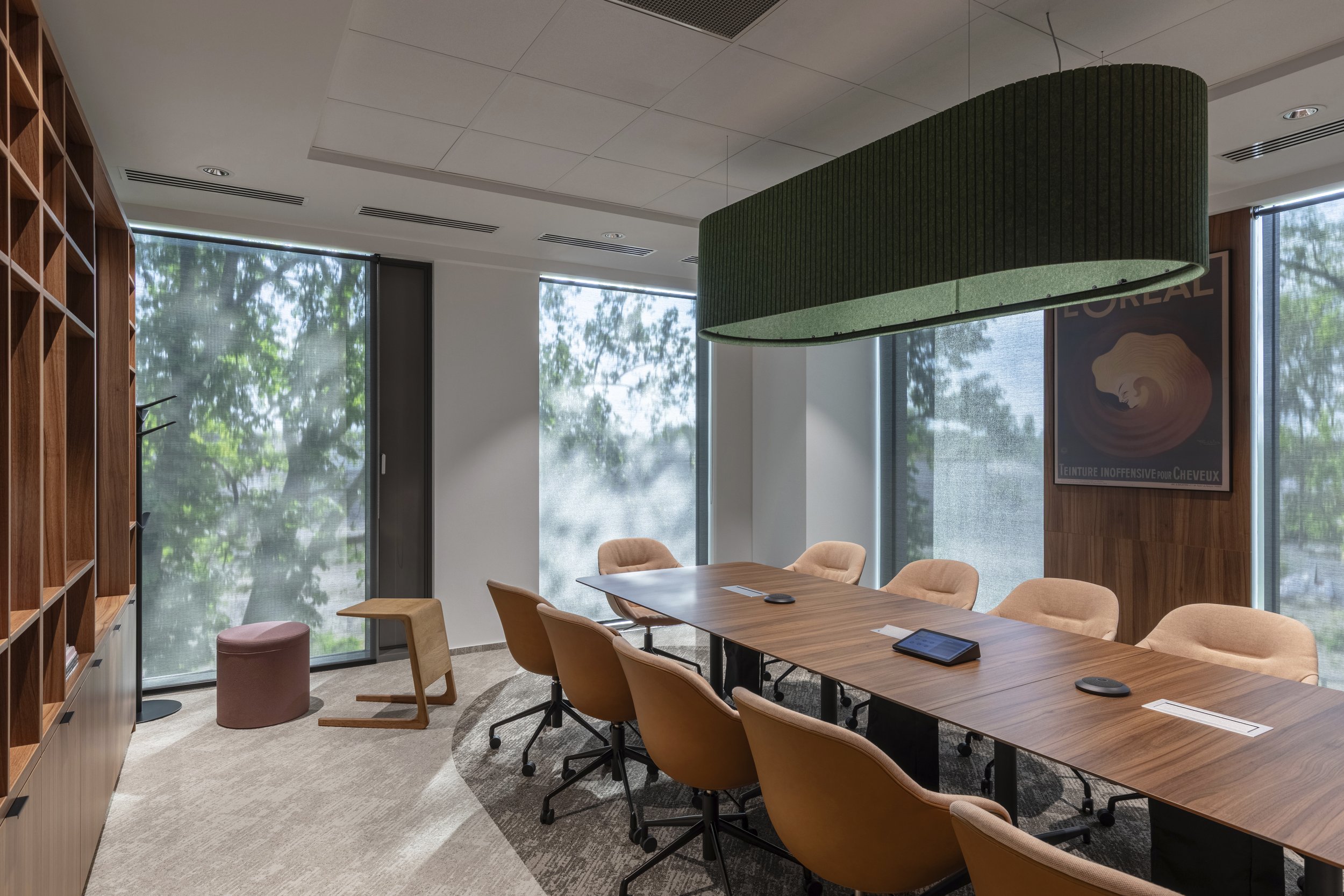 The design language draws inspiration from L’Oréal’s French heritage and its forward-thinking ethos. Clean lines, curated materials, and a sophisticated neutral palette are elevated by bold accents, a nod to the brand’s dynamic product lines. Natural textures, warm wood tones, and abundant daylight soften the contemporary aesthetic, creating a harmonious atmosphere.