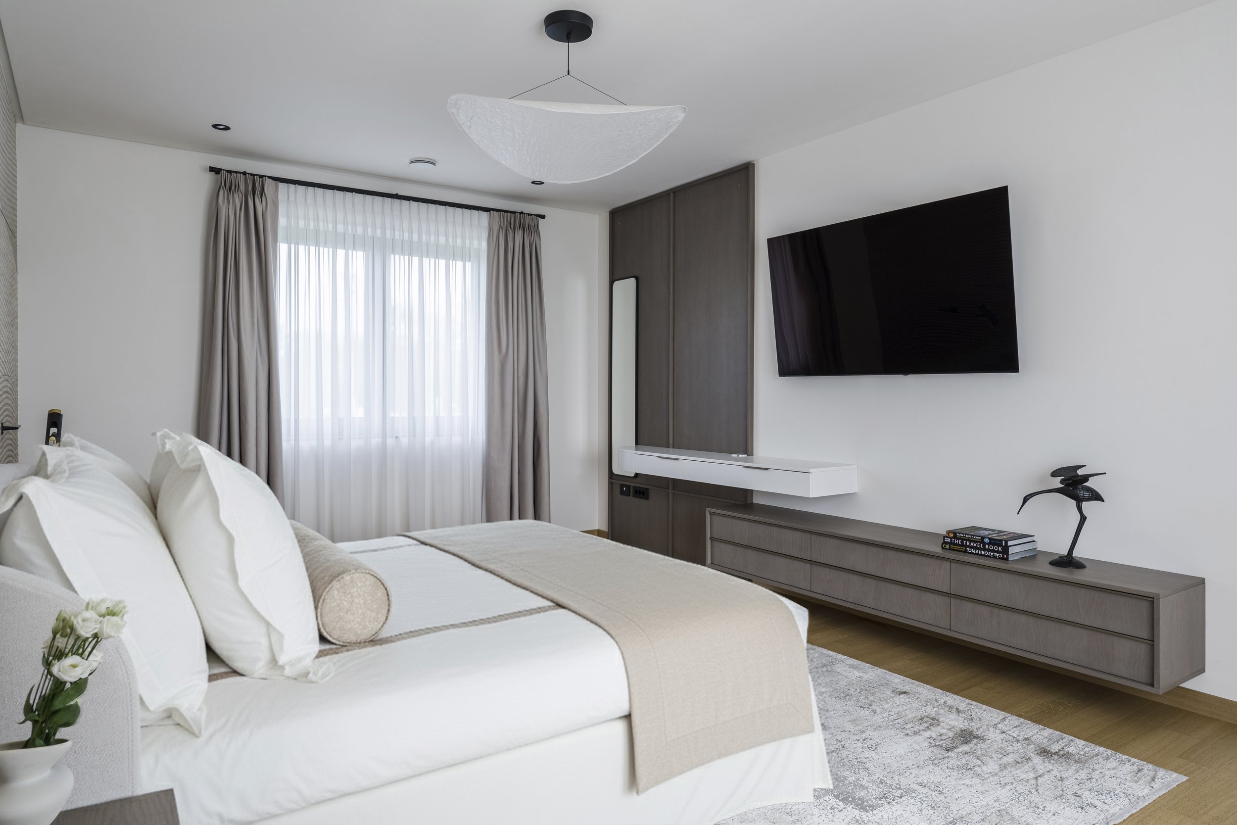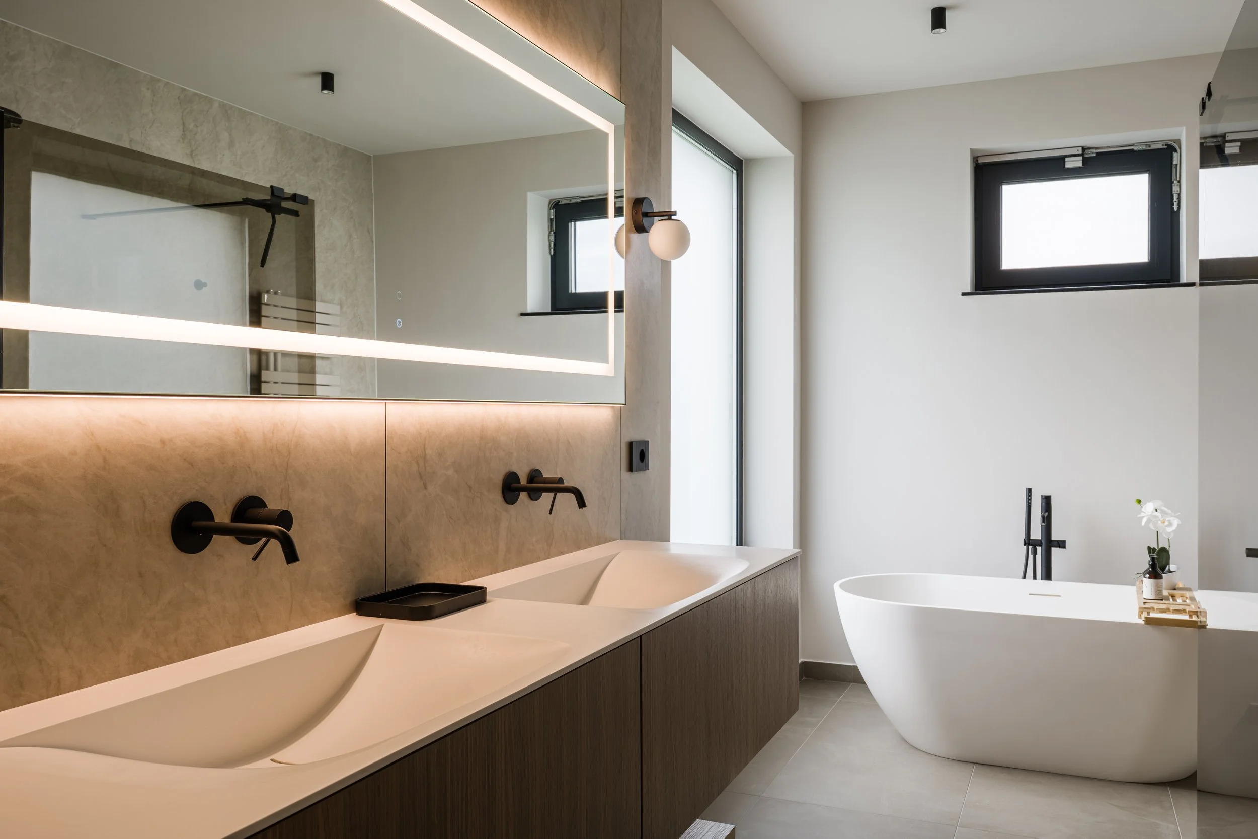 The bathrooms continue the design narrative with refined stone textures, vessel sinks, and thoughtfully chosen mirrors that enhance both space and light. Each room is crafted with a focus on tranquility in daily rituals.
